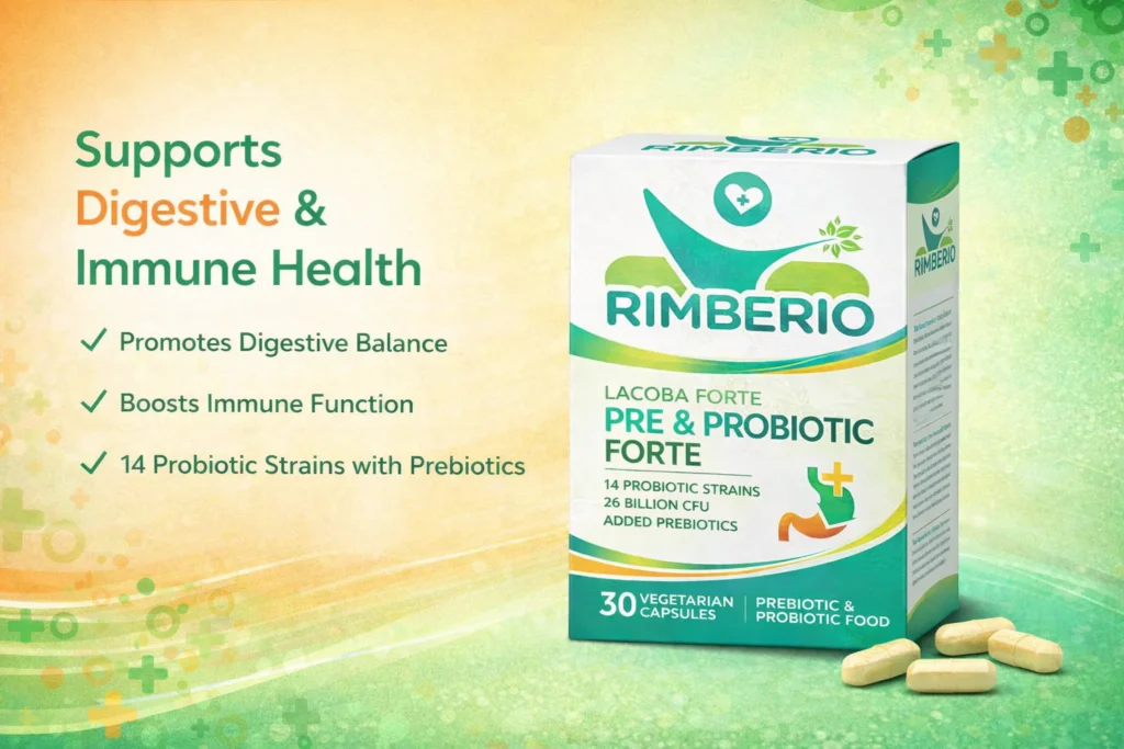 Rimberio Prebiotic & Probiotic Forte features an advanced formula combining 14 scientifically selected probiotic strains with a plant-based prebiotic, providing comprehensive support for digestive balance and overall daily wellness.